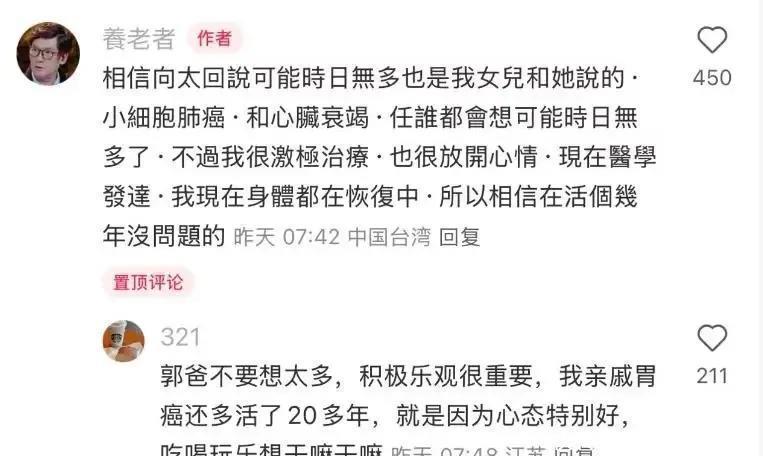 这场风波的导火索,藏在一场充满错位的舆论博弈里。此前向太在直播中一句“亲家可能时日无多”,将郭爸爸的健康状况推向热搜,引发全网对“豪门是否尽责”的追问。面对关心,郭爸爸坦诚晒出病历澄清病情,却在评论区无意间透露:“女儿要养家还要照顾我,孩子读书保姆有的没的都要花钱,靠她一个人真的很辛苦”。